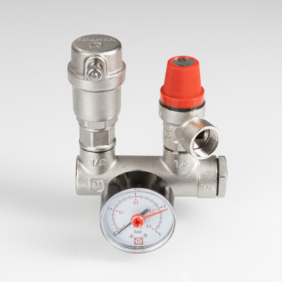Комплектная группа безопасности для оснащения котлов и бойлеров систем автономного отопления, ГВС. Применяется в установках с тепловой мощностью до 44 кВт (определяется штатным предохранительным клапаном), номинальным давлением не выше 10 бар, рабочей температурой не более 120 °С. Допустимая рабочая среда – пар, вода, незамерзающий теплоноситель (максимальное содержание гликолей – 50 %). Состав изделия: предохранительный клапан (настройка – фиксированная, 3 бара), автоматический воздухоотводчик, манометр со шкалой 0–4 бар, латунный никелированный корпус. Предусмотрен резьбовой патрубок для подключения расширительного бака (диаметр – 3/4”). Группа безопасности котла монтируется на выходе теплогенератора. Резьба присоединения – внутренняя, 1”.