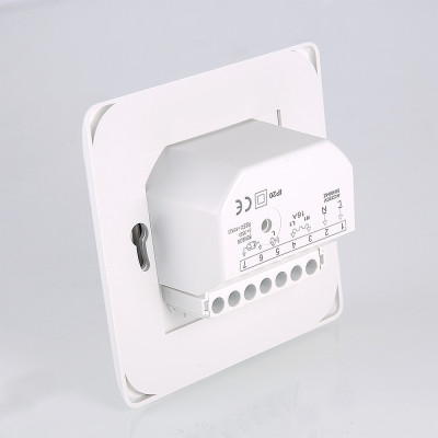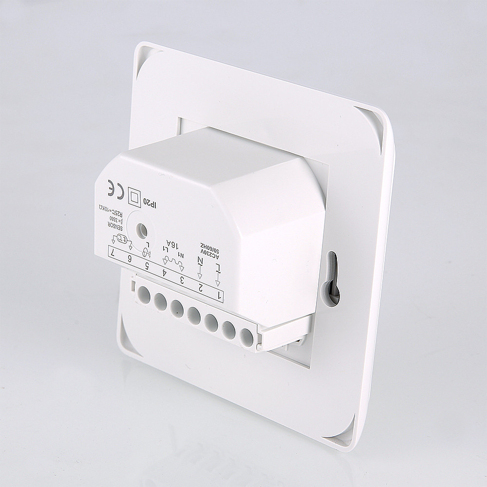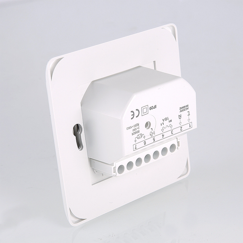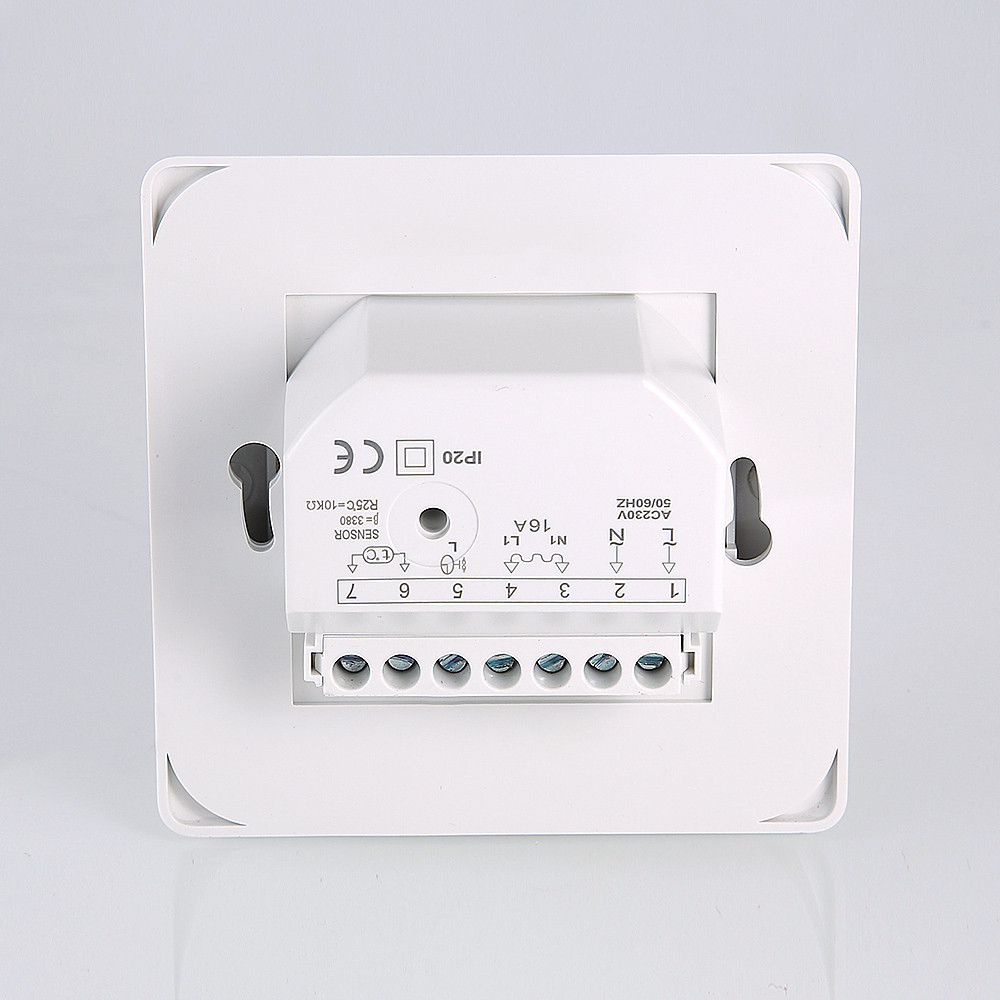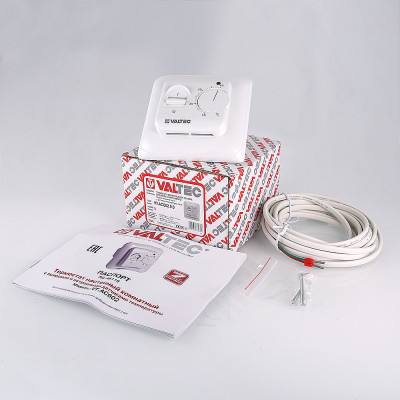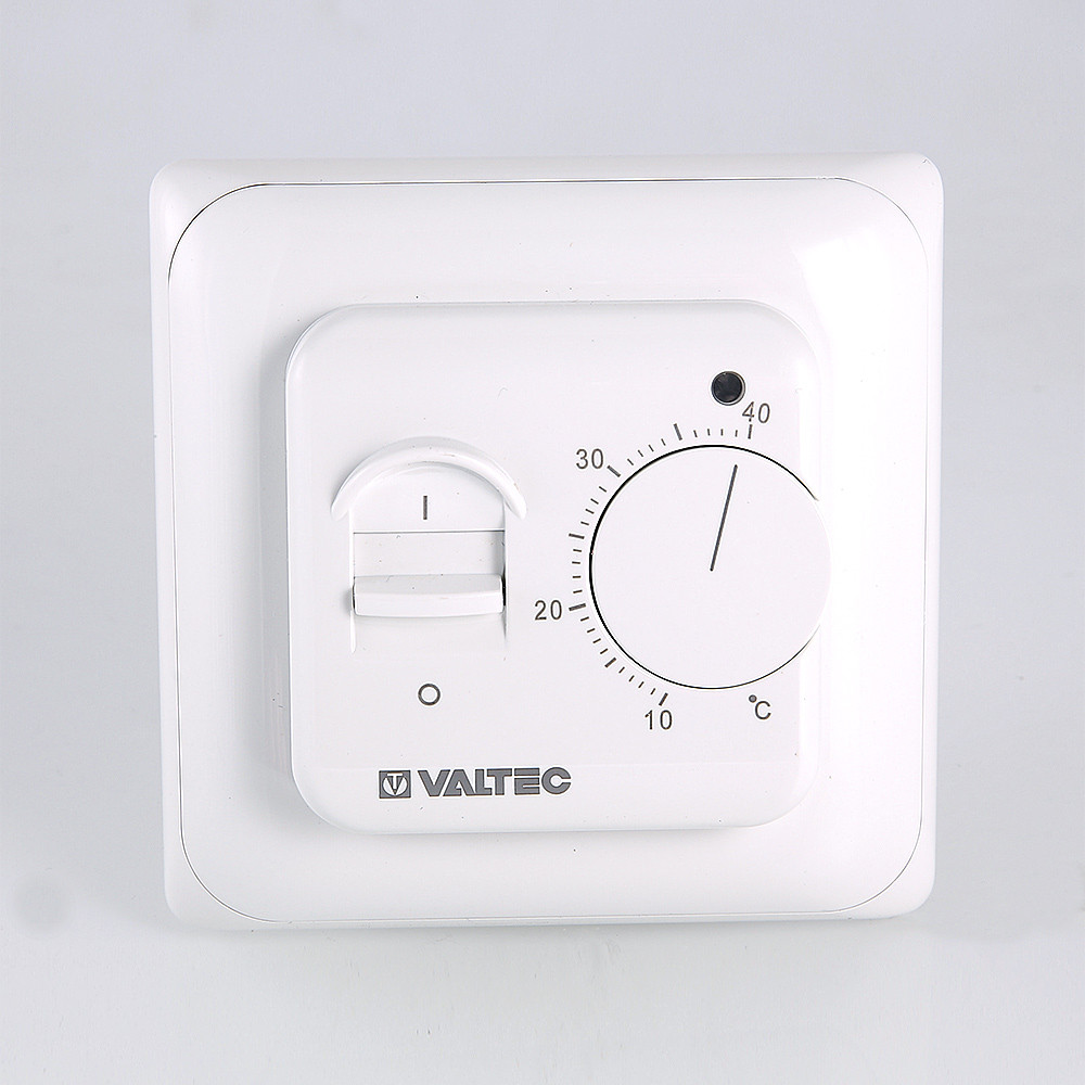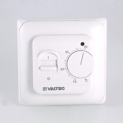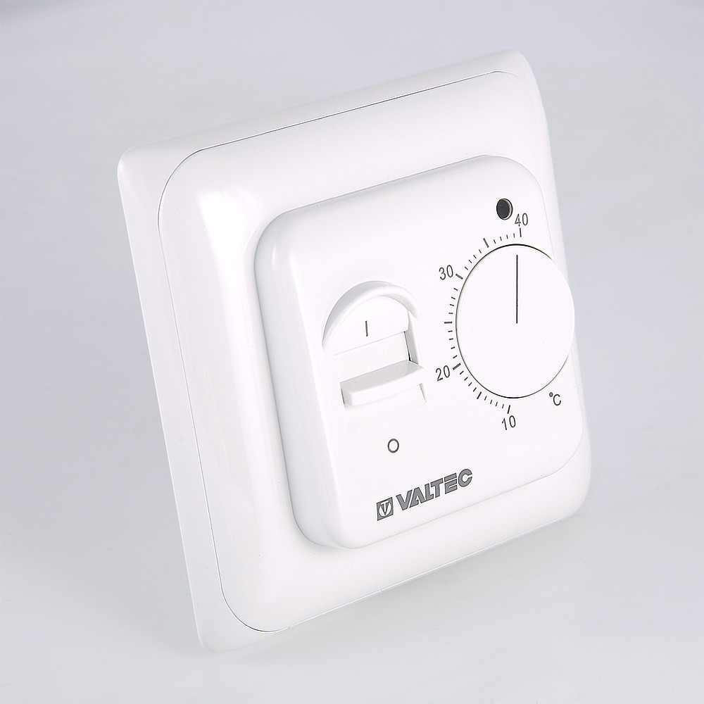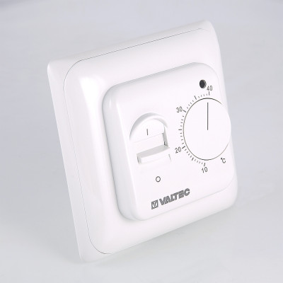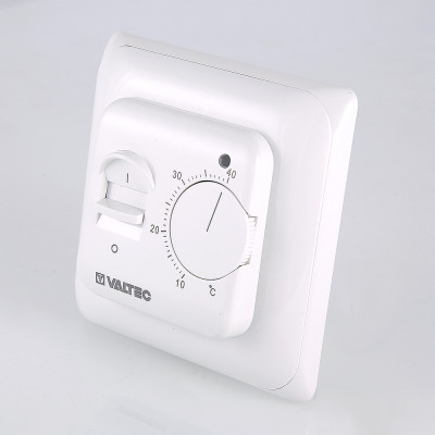 Настенный комнатный термостат с выносным и встроенным датчиками температуры. Обеспечивает поддержание температуры воздуха помещения или нагреваемой поверхности посредством двухпозиционного управления оборудованием климатических систем (прежде всего – теплого пола). При одновременном задействовании датчиков внешний является ограничительным. Пользователь задает значение регулируемого параметра настроечным колесиком. Термостат оснащен клавишей включения/выключения; состояние прибора отображается светодиодным индикатором. Монтаж термостата производится в стандартную коробку скрытой проводки.