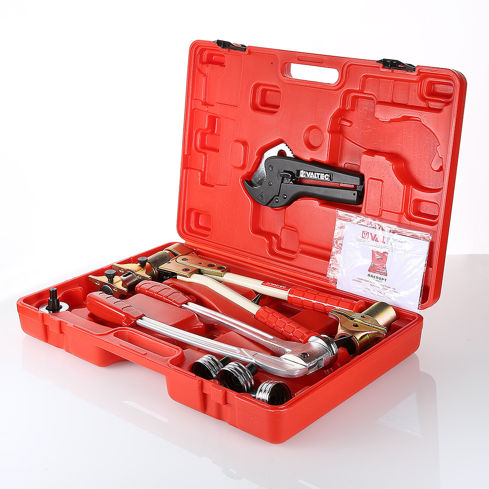 Комплект ручного инструмента для монтажа надвижных фитингов трубопроводов из сшитого полиэтилена диаметром от 16 до 32 мм.