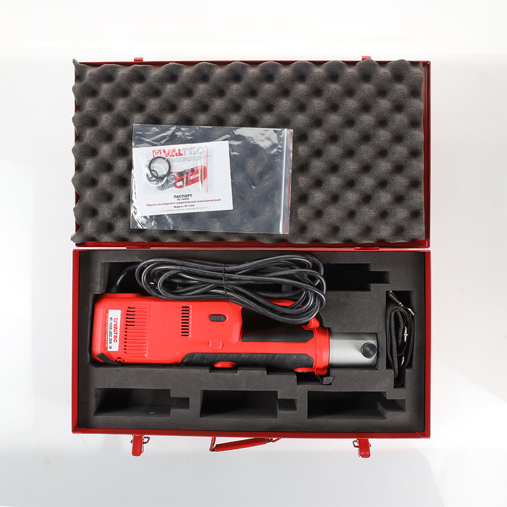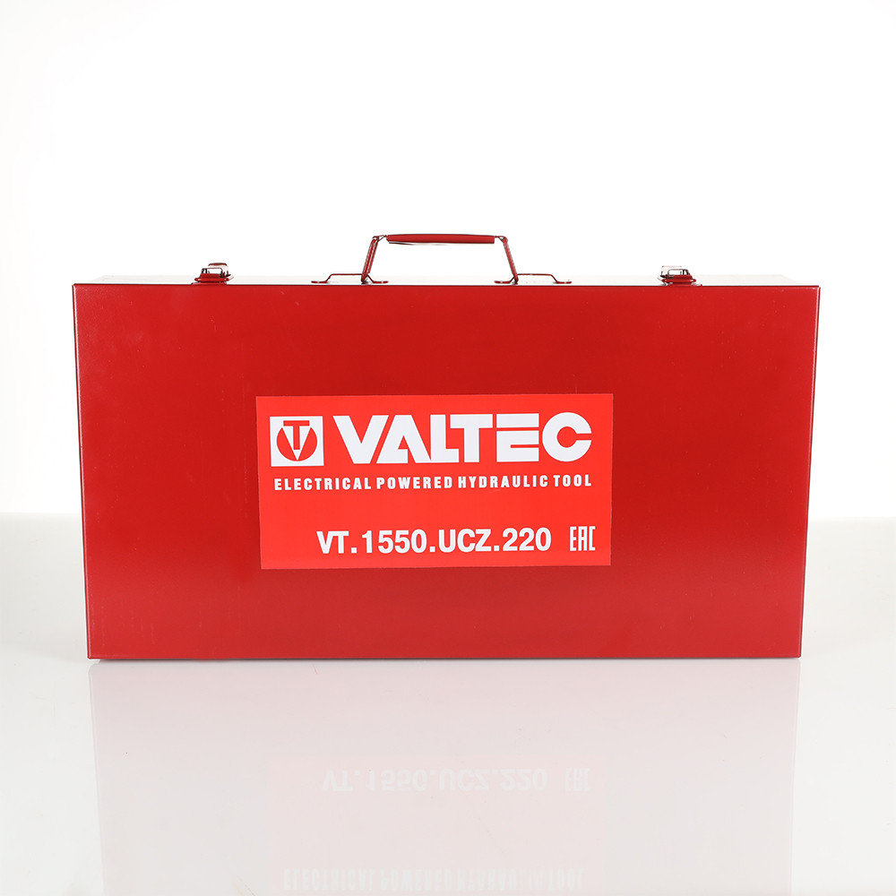 Пресс-инструмент электрический VALTEC UCZ поставляется в удобном металлическом кейсе с гнездами для насадок.