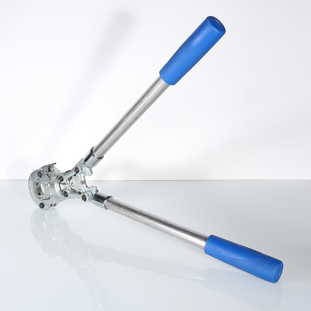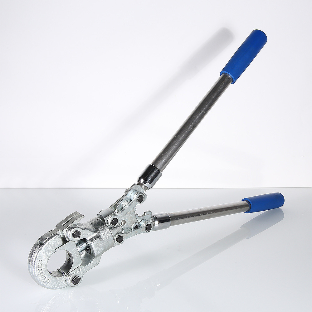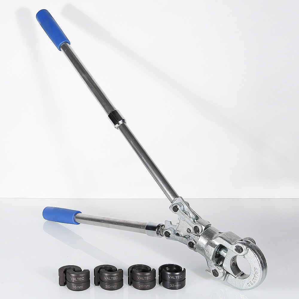 Радиальные клещи для ручного обжатия пресс-фитингов трубопроводных систем из полимерных и металлополимерных труб. Усилие обжатия зависит от длины телескопических рукояток и регулируется также механизмом пресс-головки, которая, кроме того, может поворачиваться относительно рукояток на 360°. Масса пресс-инструмента без насадок – 3,1 кг. Клещи комплектуются насадками с профилем ТН, предназначенными для монтажа пресс-фитингов VALTEC диаметром 16, 20, 26, 32 мм.