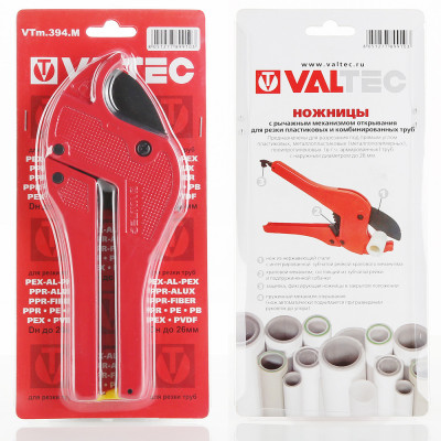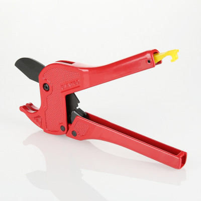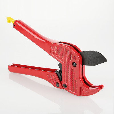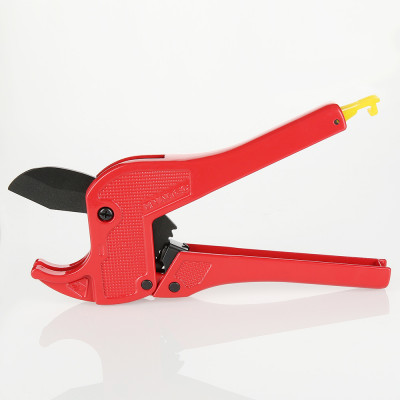 Ножницы с храповым механизмом для металлополимерных и пластиковых труб (до 26 мм) обеспечивают перпендикулярное разрезание трубы без деформации её стенок. Это достигается конфигурацией опорной скобы, поступательным движением ножа, поднятие которого происходит при разведении рукояток. Кроме зубчатого храпового механизма ножницы оснащены лезвием из закаленной стали, рычажным открывающим механизмами, фиксирующей защелкой. Изделие рекомендуются для работы с трубами диаметром до 26 мм.