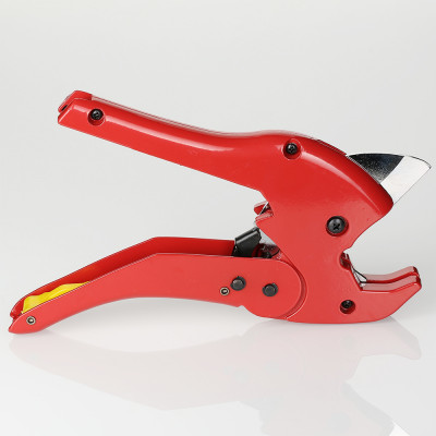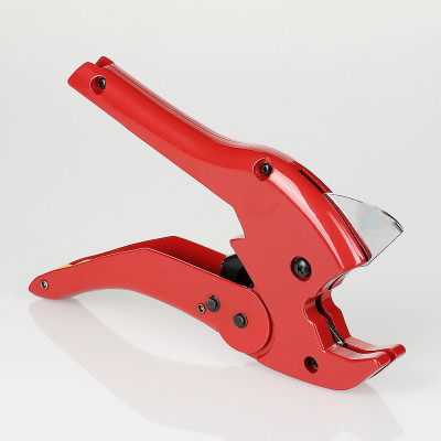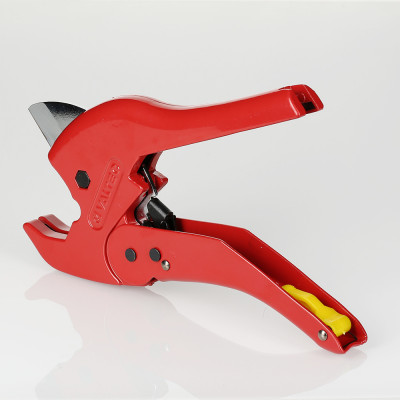 Ножницы с храповым механизмом для металлополимерных и пластиковых труб (до 40 мм). Обеспечивают разрезание под прямым углом труб указанного диаметра. Конструкция инструмента включает в себя нож из нержавеющей стали, храповой механизм, подпружиненную защелку, фиксирующую ножницы в закрытом положении. Внутри рукоятки расположена пружина, поднимающая нож.