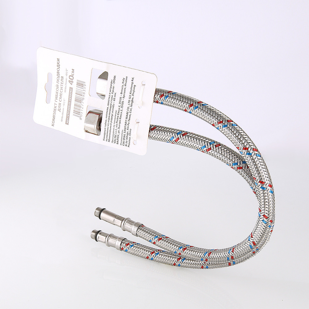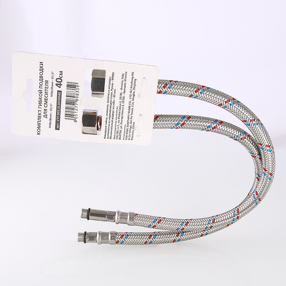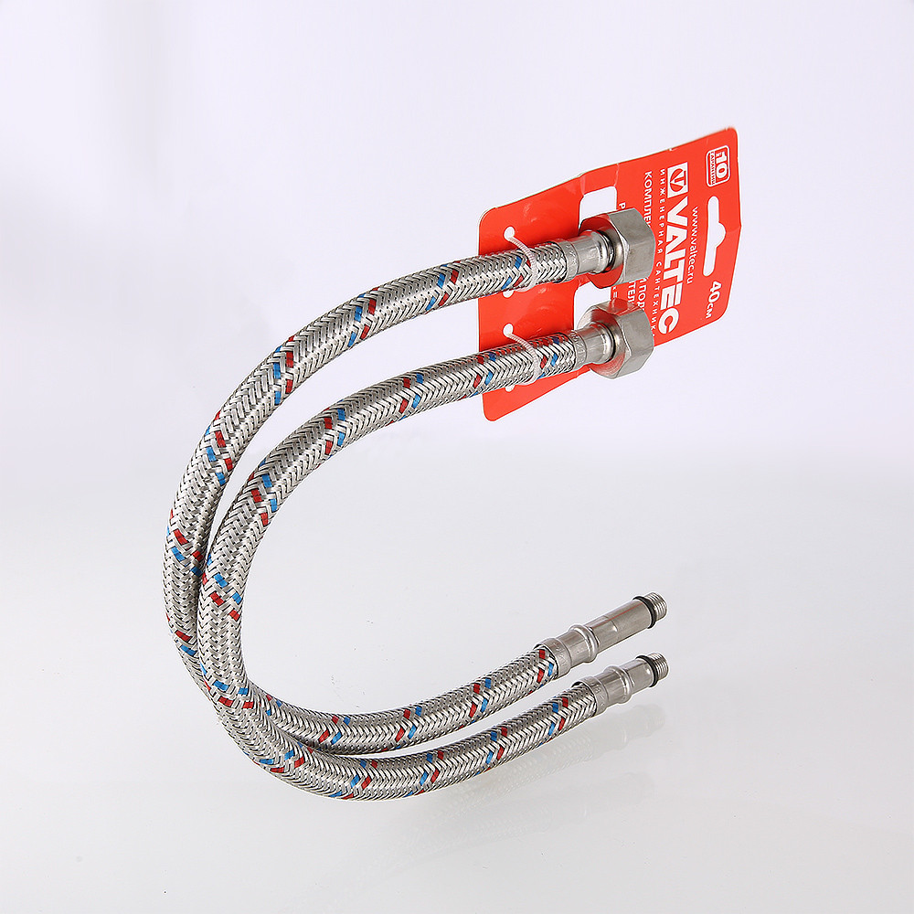 Комплект гибкой подводки для подключения смесителя объединяет в себе пару подводок гибких VALTEC c концевыми элементами гайка–штуцер, 1/2” х M10, длина штуцера – 18 и 35 мм (такое сочетание обеспечивает удобное подсоединение подводки).