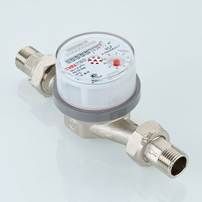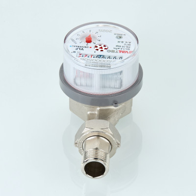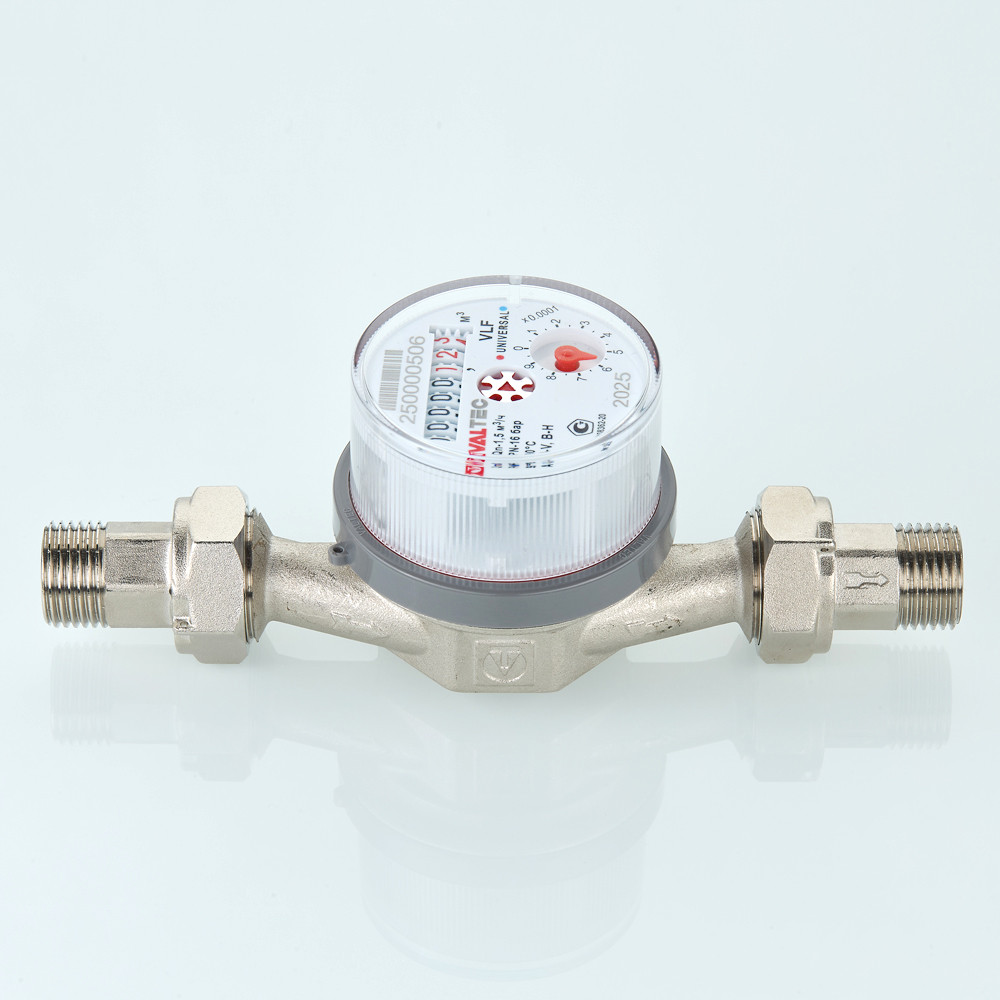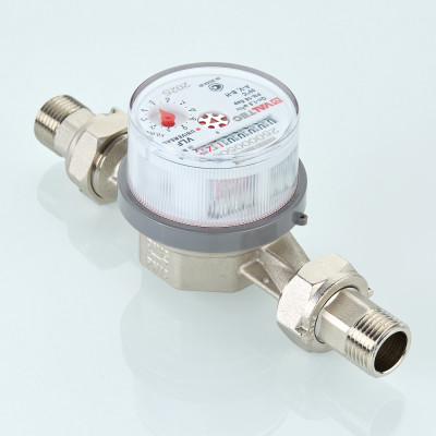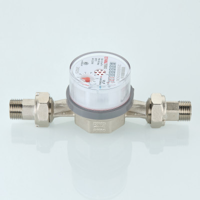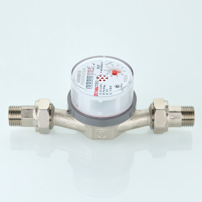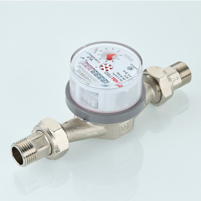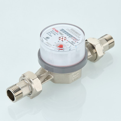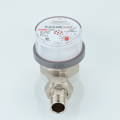 Водосчетчик универсальный – для измерения расхода холодной и горячей воды, главным образом – в квартирах. Условный диаметр модели – 1/2"; номинальный расход воды – 1,5 куб. м/ч. Длина прибора без сгонов – 110 мм. Резьба присоединительных патрубков – 3/4".