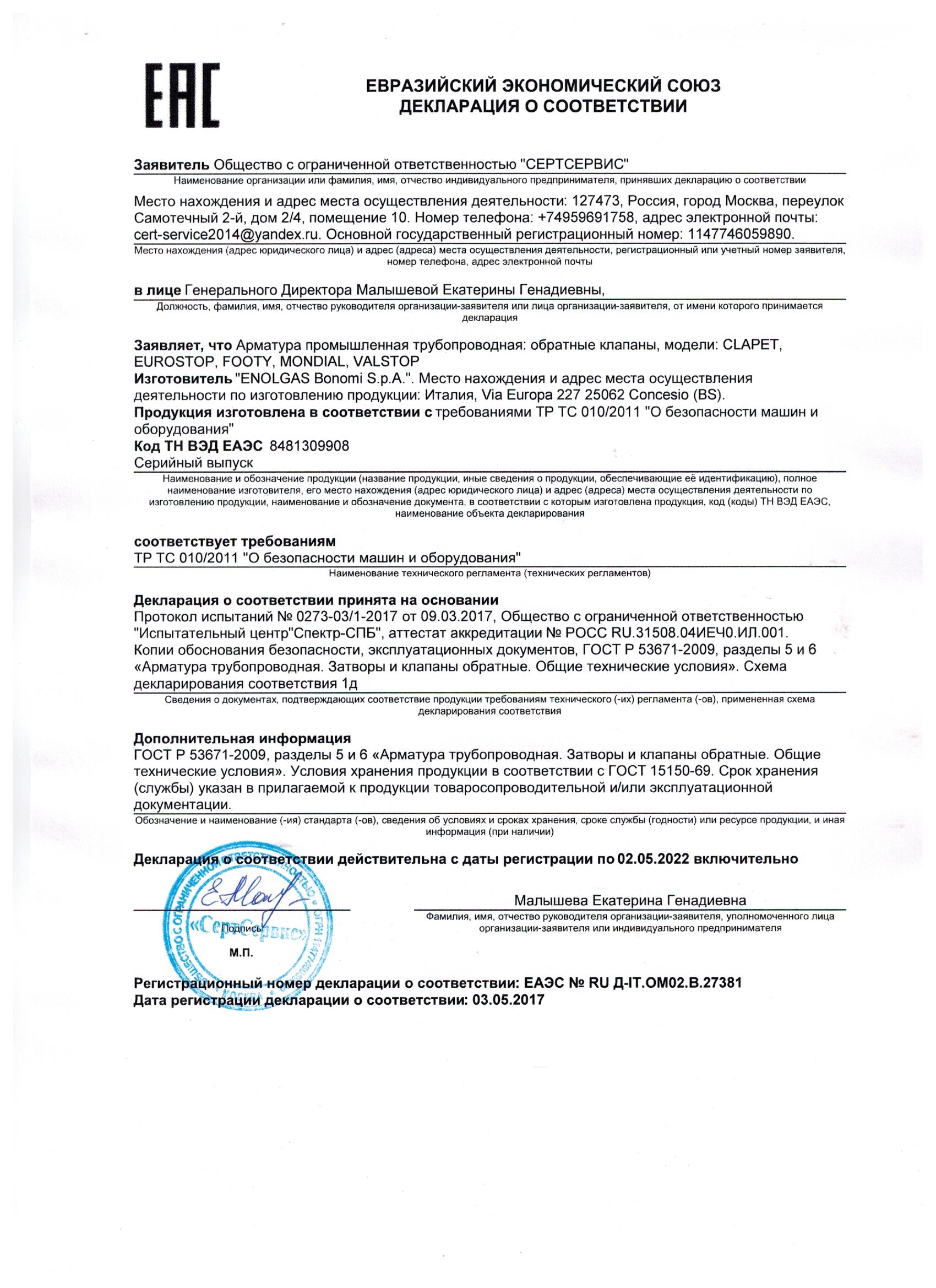 Клапан обеспечивает движение рабочей среды в трубопроводе только в заданном направлении, исключая ее обратный ход. Применяется в системах транспортировки сжатого воздуха, холодной и горячей воды, углеводородного топлива, масел и других неагрессивных к материалам изделия сред. По принципу действия – обратный клапан пружинного типа. Особенности конструкции, разработанной компанией ENOLGAS Bonomi (Италия) обеспечивают минимальные потери давления в клапане, его высокую пропускную способность, надежность, компактность и низкий уровень шума при его работе. Клапан отличается высоким качеством исполнения и может монтироваться в любом положении – вертикально, горизонтально, наклонно. Корпус клапана изготовлен из качественной сантехнической латуни (без гальванопокрытия), запирающий конус – из термостойкого термопласта Ultem, основания – нейлон. Материал уплотнителя – синтетическая резина NBR, пружины – нержавеющая сталь. Обратный клапан может использоваться при температуре от –20 до +100 ºС. Номинальное рабочее давление модели – 25 бар. Резьба присоединений – внутренняя. Вместе с сетчатой насадкой изделие можно использовать как приемный клапан водозаборных насосов.