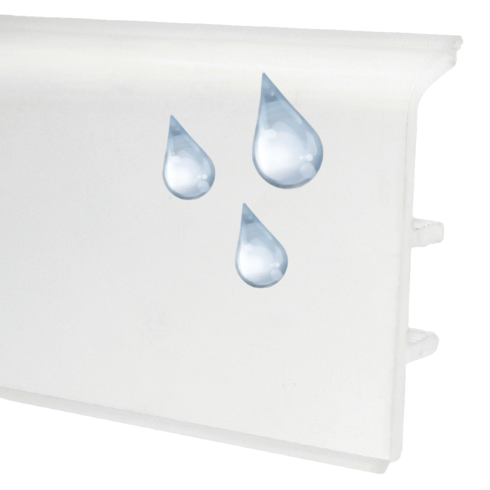 Плинтус AQUA 20 выполнен из вспененного ПВХ, оснащен кабель-каналом и мягкими кромками, позволяющими скрывать небольшие неровности стен и пола, а также защищать стык от проникновения пыли и грязи.