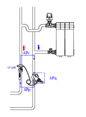 Основное назначение регуляторов – совместная работа с балансировочными клапанами VT.054 в двухтрубных системах отопления. При этом балансировочным клапаном VT.054 устанавливается расчетное значение увязочного перепада давления в обслуживаемом контуре (ΔРу), а регулятором перепада давлений поддерживается расчетный перепад давления по этому участку (ΔPн). В случае, когда применение балансировочного клапана не требуется, импульсную трубку рекомендуется подключать к шаровому крану с дренажом и воздухоотводчиком VT.245, имеющему патрубки с внутренней резьбой 1/4” (см. примеры применения).
