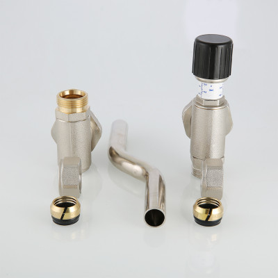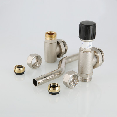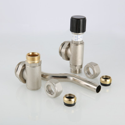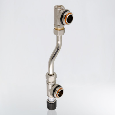 Место установки тупикового байпаса – противоположная относительно точек подключения сторона коллекторного узла. Материал корпуса – латунь марки CW617N, перепускной трубки – медь, уплотнений – EPDM. Гальванопокрытие – никелирование. Изделие применимо при температуре не выше 120 °C, давлении до 10 бар. Диапазон настройки перепада давлений – 20–60 кПа, пропускная способность Kvs – 4,33 м3/ч.