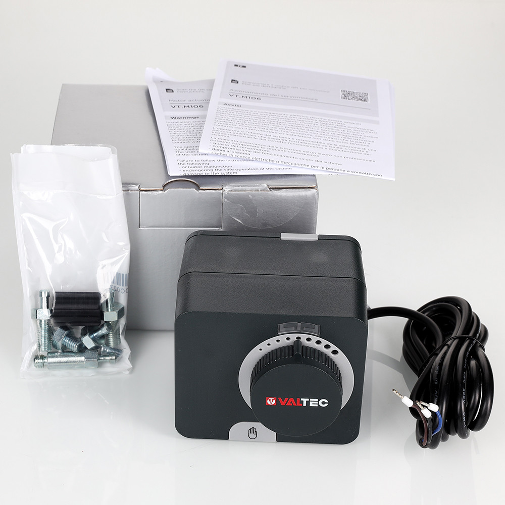 Электропривод поворотный трехпозиционный предназначен для автоматического управления трех- и четырехходовыми смесительными клапанами VALTEC и аналогичными им с помощью термостата или контроллера. Управление – импульсное. Напряжение питания – 230 или 24 В. Возможно переключение на ручное управление. Привод подключается к клапану с помощью переходной втулки (входит в комплект поставки). Максимально допустимая температура нагрева корпуса клапана (арматуры) – 150 °С.