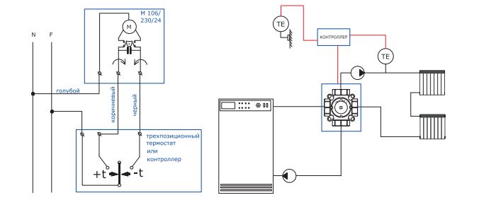 Схема подключения привода VT.M106 с управлением от трехпозиционного термостата