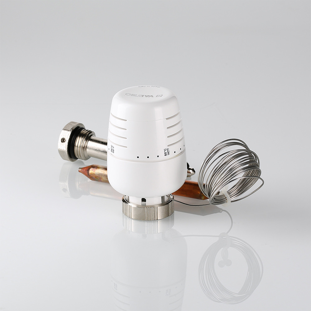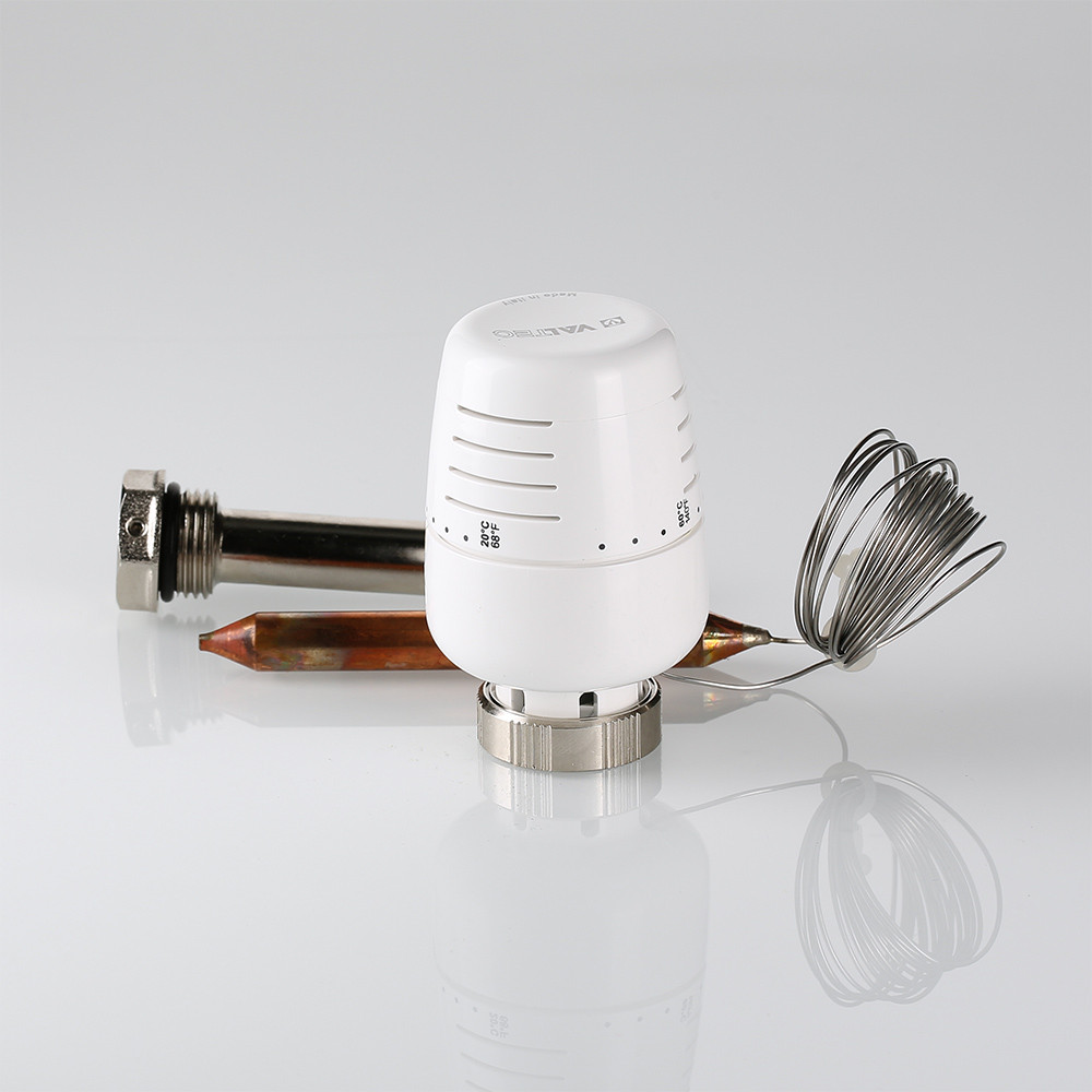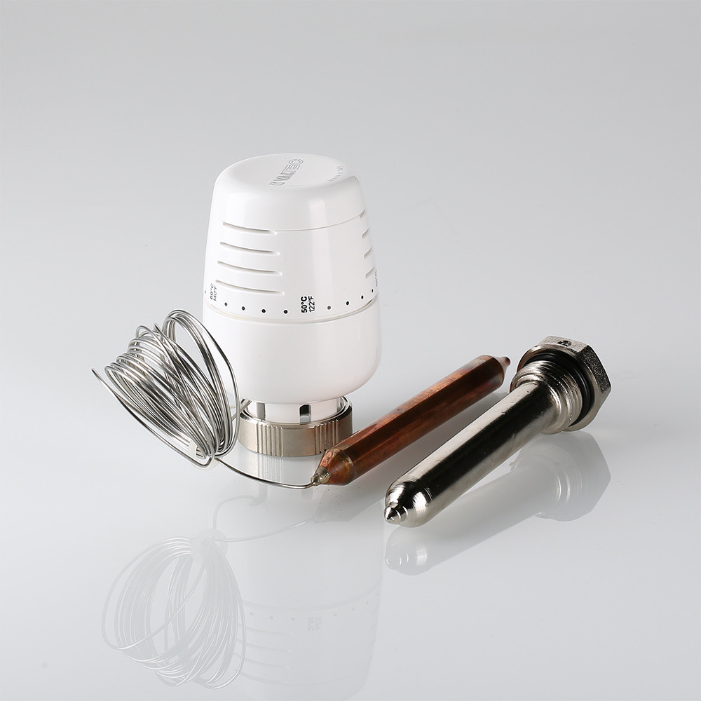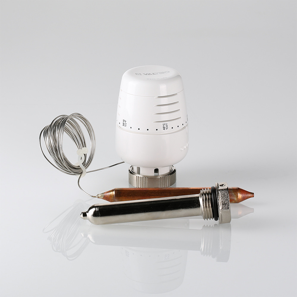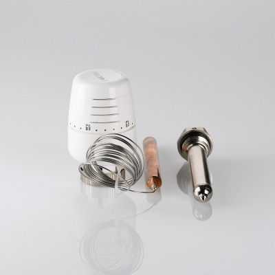 Термостатическая головка, соединенная медной капиллярной трубкой длиной 2 м с выносным погружным датчиком жидкостного типа. Диапазон регулирования – от 20 до 60 °C. Датчик устанавливают в латунную гильзу с наружной резьбой на 1/2". Головка применяется для управления термостатическим клапаном в составе насосно-смесительных узлов напольного отопления (теплый пол).