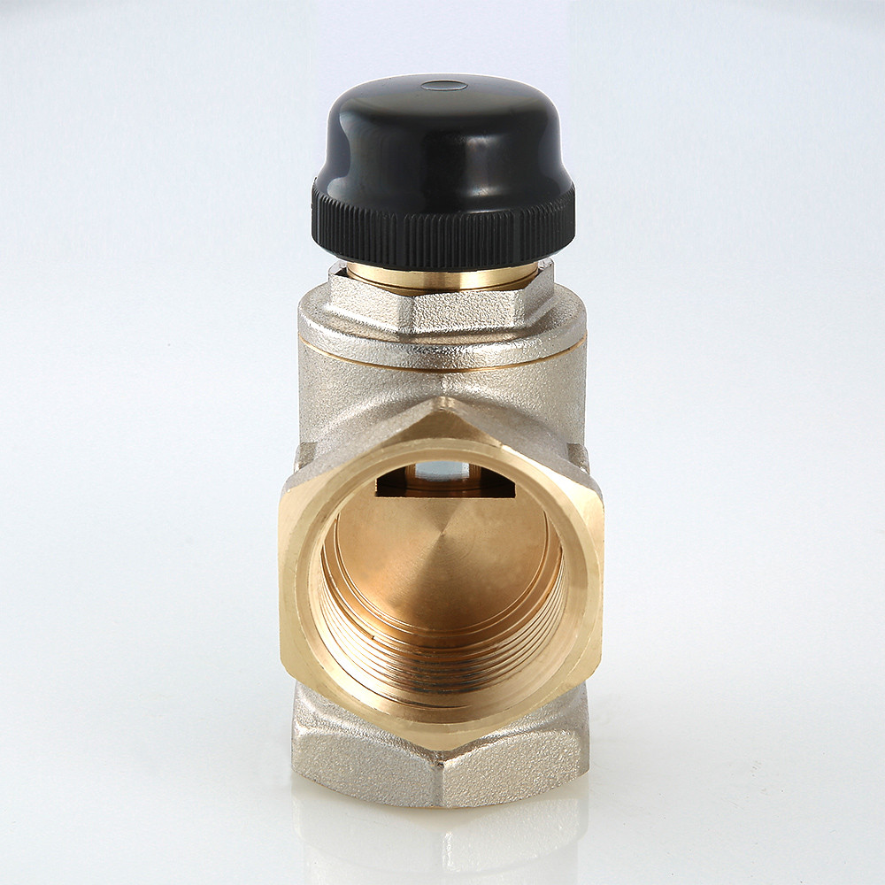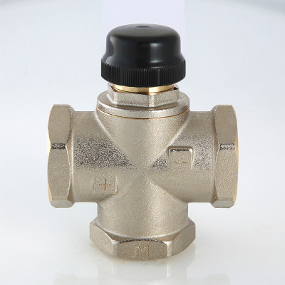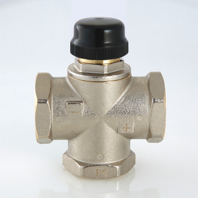 Клапан предназначен для использования в смесительных узлах гидравлических систем (байпасные узлы подмеса, узлы смешения для получения заданного уровня температуры смешанной жидкости и т.п.). Регулирование клапаном может осуществляться вручную или с помощью сервопривода. Корпус выполнен из латуни марки CW617N (европейский стандарт EN 12165), никелирован. Материал штока, основания золотника и пружины – нержавеющая сталь марки AISI 316, золотникового уплотнителя – EPDM. Резьба присоединительных патрубков – внутренняя, 1". Данная модель – c центральным смешением и допускает полное перекрытие входных патрубков.