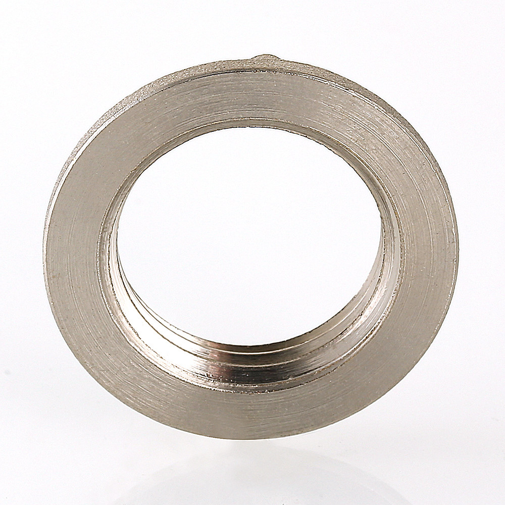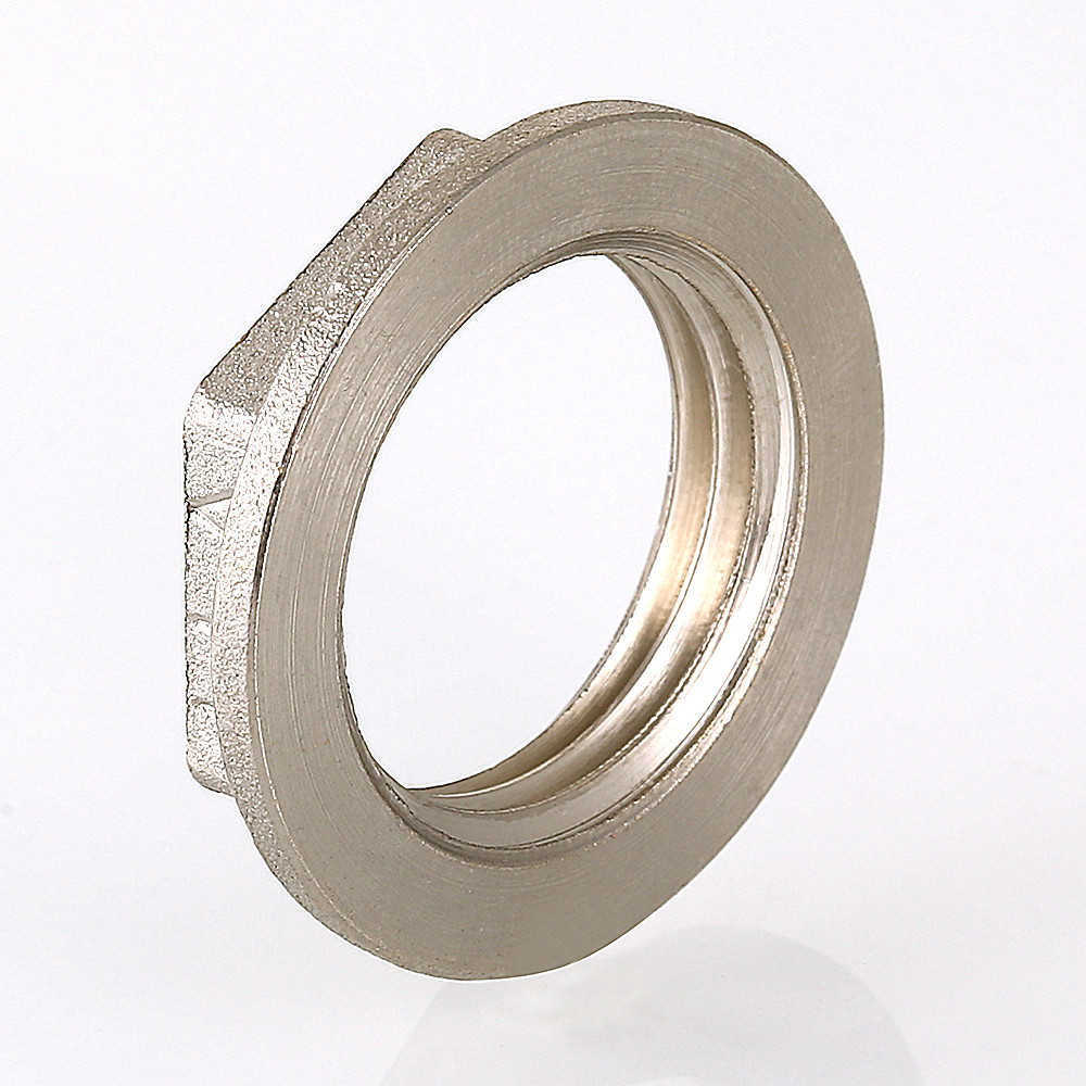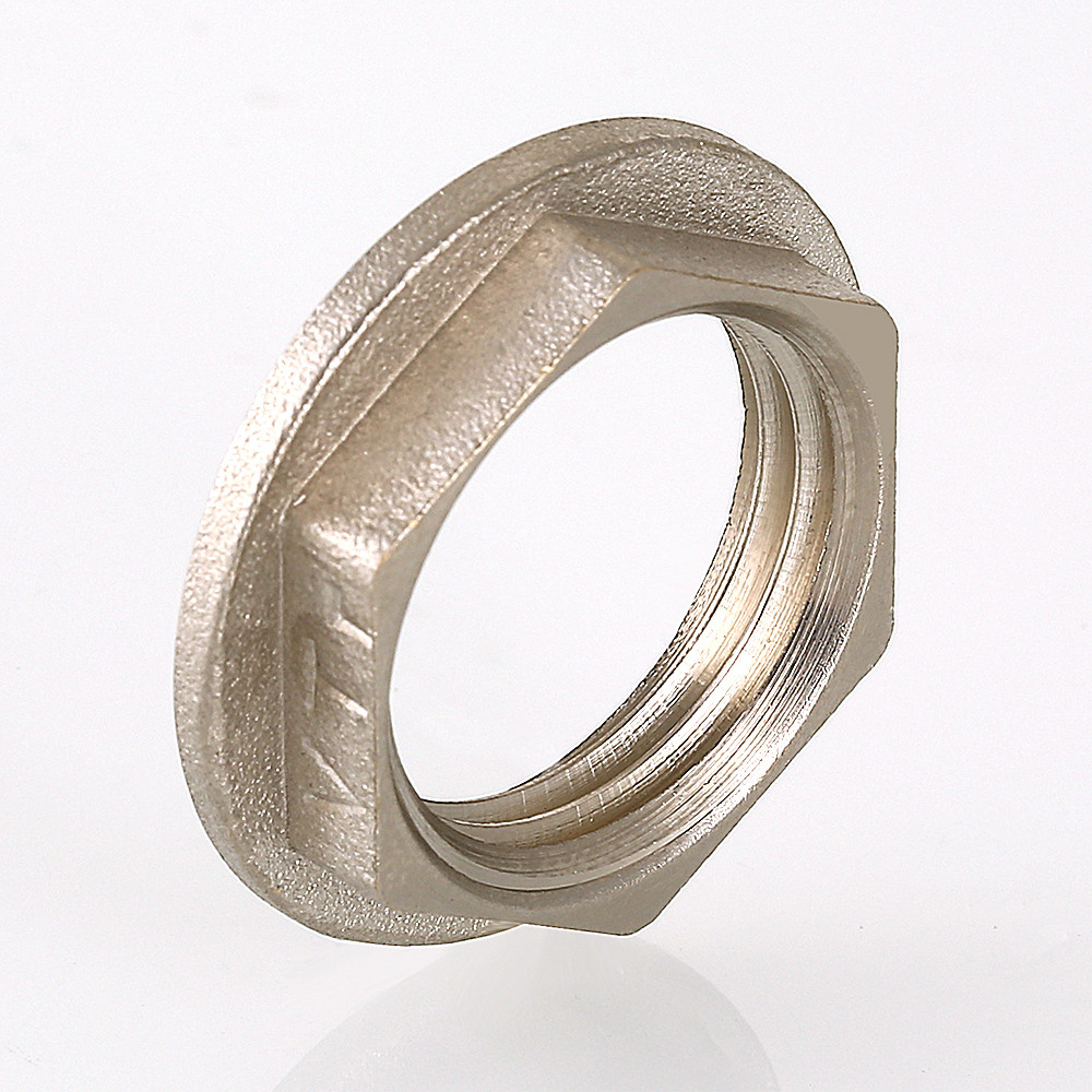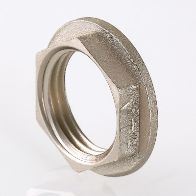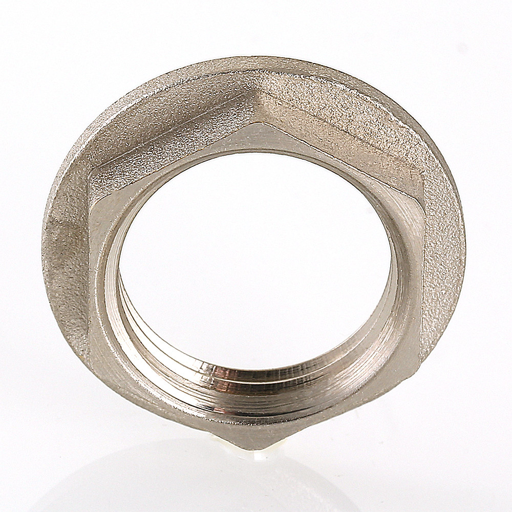 Контргайка – простой и эффективный вид гаечных замков, предназначенных для недопущения самопроизвольного раскручивания элементов резьбовых соединений (муфт, сгонов, пр.) при вибрации, гидравлических ударах. Реборда, выступающая за шестигранную часть гайки, увеличивает надежность фиксации, повышает герметичность, улучшает внешний вид соединения (скрывает волокна уплотнителя). Как и другие резьбовые фитинги VALTEC, контргайка с ребордой выполнена методом горячего штампования из латуни CW617N с последующим никелированием, имеет трубную цилиндрическую резьбу, совместимую с конической.