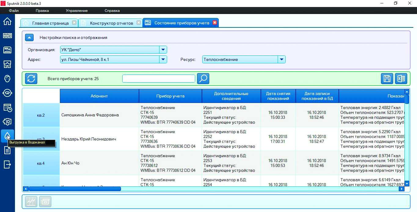 • пользовательское ПО. Эта часть программы позволяет пользователям просматривать показания приборов учета, видеть статистику водопотребления, формировать отчеты за любой интервал времени в формате Еxсel. Удобный интерфейс обеспечивает возможность производить сортировку любого типа – по адресам, по абонентам, по типам энергоресурсов, по номерам приборов учета. При необходимости возможна интеграция со смежными программными комплексами, такими как 1С, ГИС ЖКХ, ЕИЦ и другими.