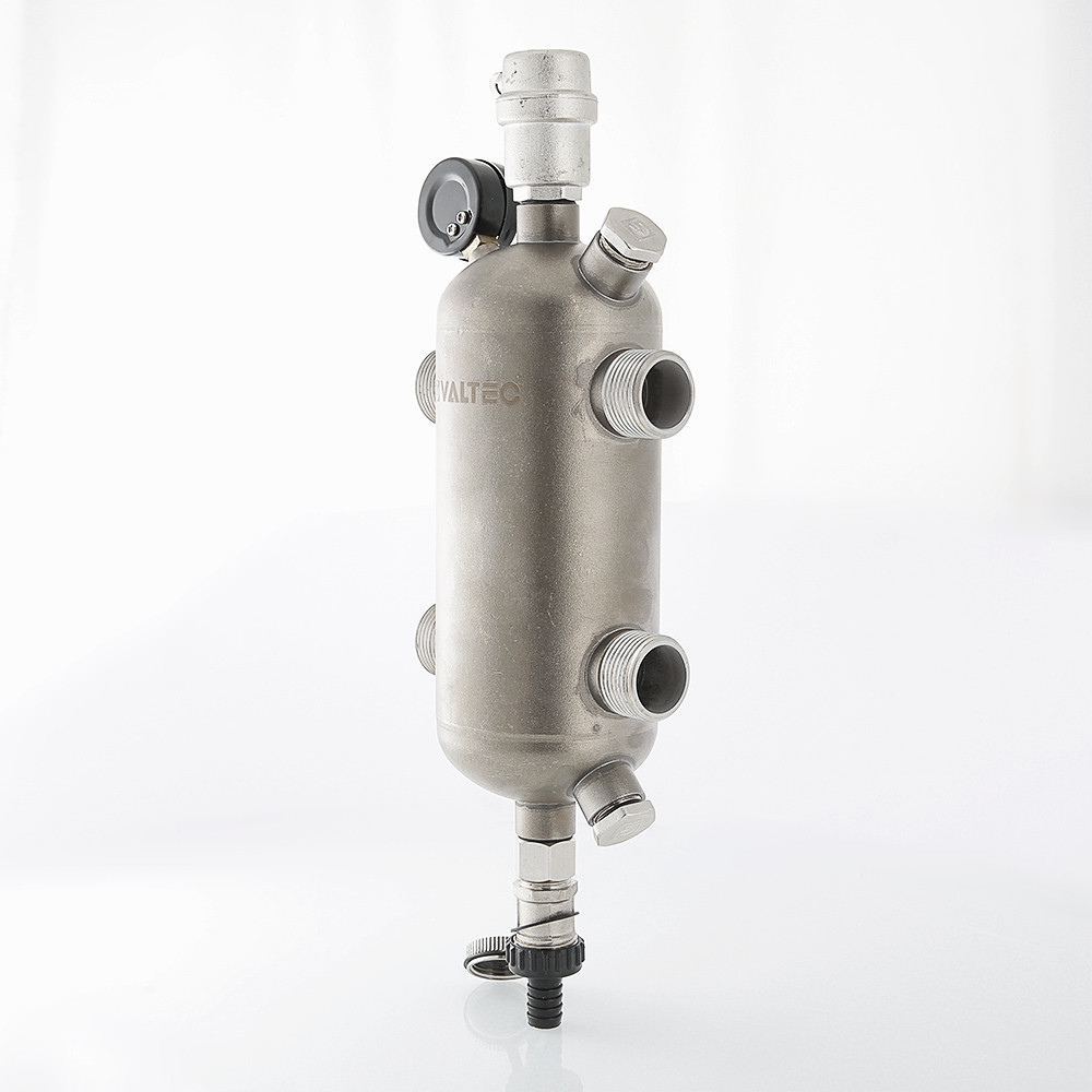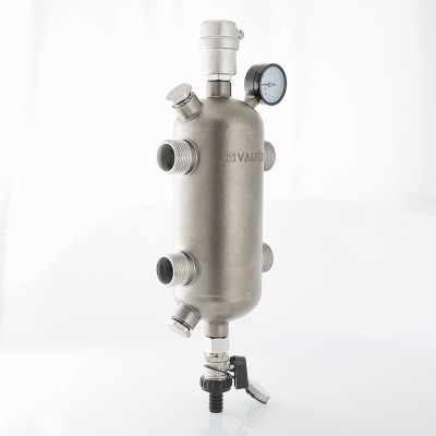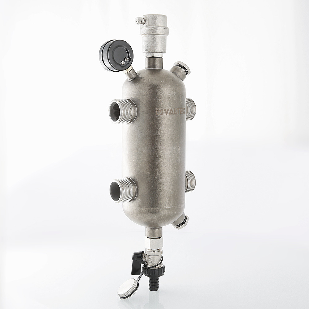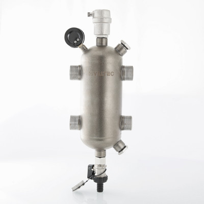 Гидравлическая стрелка из нержавеющей стали комплектуется манометром, дренажным клапаном, автоматическим воздухоотводчиком с отсекающим клапаном. На корпусе предусмотрены резьбовые патрубки для дополнительной установки датчика температуры, термометра, магнитного шламоуловителя. Патрубки заглушены резьбовыми пробками.