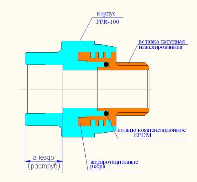 Для соединения полипропиленовых трубопроводов с резьбовыми элементами системы выпускаются комбинированные фитинги с латунными никелированными закладными деталями. Запатентованная конструкция закладных элементов комбинированных фитингов обеспечивает надёжную защиту от проникновения рабочей среды между корпусом и закладным элементом. Между корпусом и металлическим элементом предусмотрено компенсационное EPDM-кольцо. Продукция рассчитана на максимальную рабочую температуру 95 °C, номинальное давление – 25 бар.