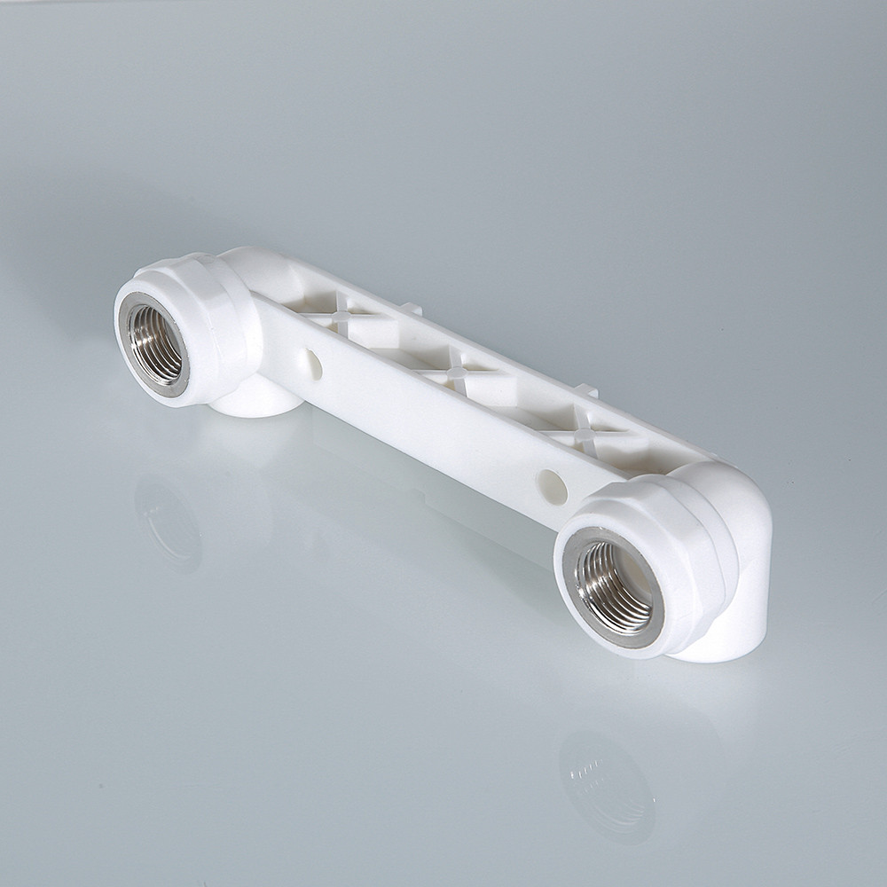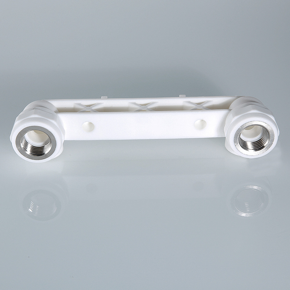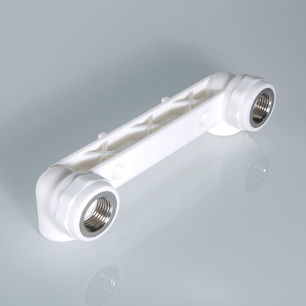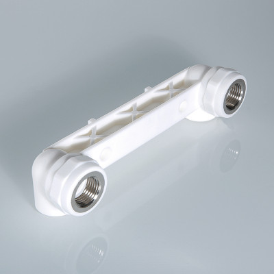 Монтажная планка с угловыми полипропиленовыми фитингами (водорозетками), предназначенными для подключения сантехнического смесителя со стандартным межосевым расстоянием (150 мм) к водопроводу из полипропиленовых труб.