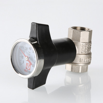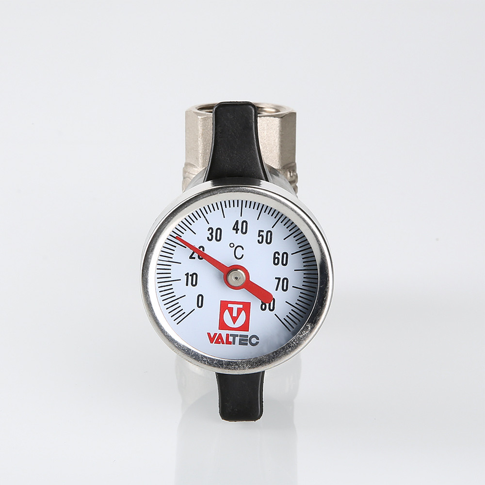 Термометр, встроенный в рукоятку управления шарового крана VALTEC BASE VT.808, обеспечивает визуальный контроль температуры рабочей среды в тепловых пунктах, узлах ввода горячей воды, трубопроводах обвязки бойлера и других точках инженерных систем. Термометр соединен с шаровым затвором гильзой из медного сплава, что позволяет измерять температуру с минимальной погрешностью. При необходимости прибор легко извлекается из рукоятки, а его гнездо закрывается заглушкой из ABS-пластика. Из этого же материала выполнена и сама рукоятка крана. Диаметр шкалы термометра – 42 мм, диапазон измерений – 0–80 °С. Резьба присоединения шарового крана с термометром VT.808 – внутренняя.