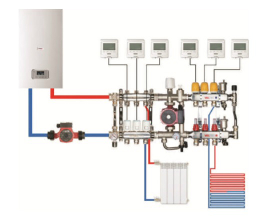 Рис. 1. Регулирование комбинированной системы отопления с помощью комнатных термостатов и сервоприводов