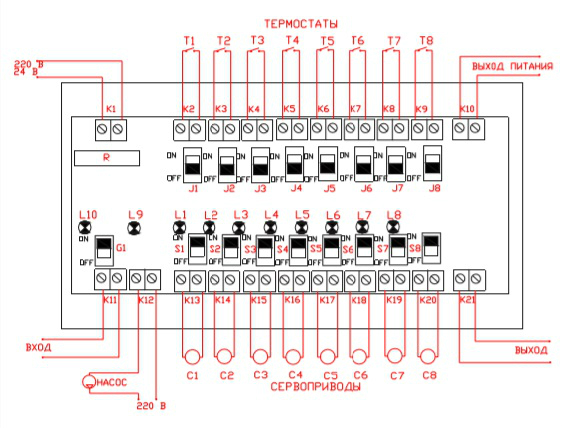 J1–J8 – переключатели передачи сигнала. В положении OFF управляющий сигнал передаётся на клеммную пару управления сервоприводами, расположенную напротив (K2–K13–C1; K3–K14–C2 и т.д.). В положении ON сигнал на клеммную пару управления сервоприводами передаётся от соседнего (расположенного cлева) термостата. Это позволяет одним термостатом управлять сразу несколькими сервоприводами. Например, на рисунке 3 сервоприводами С2, С3 и С4 управляет один термостат Т2 через клеммную пару К3, а сервоприводами С5, С6 и С7 управляет термостат Т3 через клеммную пару К6;