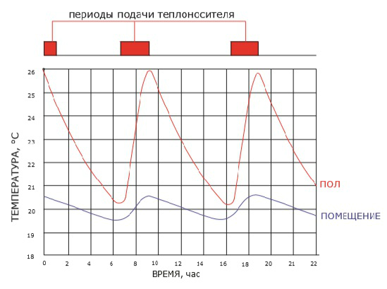 Рис. 5. График изменения во времени температуры пола и помещения при прерывистом отоплении