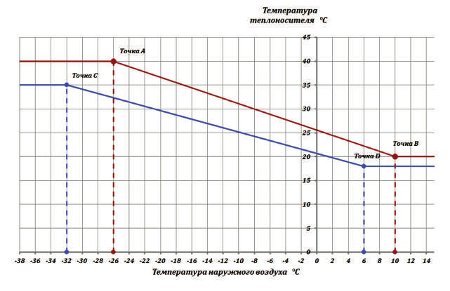Крайняя правая точка (точка В или D) определяется по личностным теплоощущениям конкретного потребителя и далее корректируется на основании опыта эксплуатации.