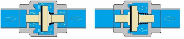 Во внутридомовых системах водоснабжения и отопления, как правило, используются дисковые пружинные обратные клапаны. Работа такого клапана происходит следующим образом (рис. 1): когда давление до клапана меньше или равно давлению за ним, золотник прижат к седлу, и клапан находится в закрытом положении. Как только давление перед клапаном станет превышать давление после клапана, его золотник переместится от седла, позволяя рабочей среде протекать через клапан. При попытке изменения направления потока, в определенный момент, скорость потока становится нулевой, затвор возвращается в исходное закрытое положение, а давление с обратной стороны прижимает затвор, препятствуя возникновению обратного потока среды. Таким образом, данный вид арматуры относится к арматуре прямого действия, так как управляется непосредственно за счет энергии рабочей среды.