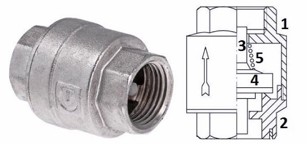 В номенклатуре фирмы VALTEC имеется несколько видов пружинных дисковых обратных клапанов для внутридомовых сетей. Обратный клапан VT.161 имеет следующую конструкцию (рис. 2): в составном латунном корпусе (1, 2) расположен подвижный золотник, состоящий из нейлонового штока (3) и нейлонового золотникового диска(тарелки) с уплотнительной прокладкой из EPDM (4). Возврат золотника в седло обеспечивается пружиной из нержавеющей стали AISI 304 (5).