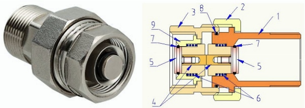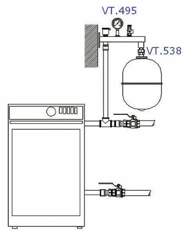 По принципу действия он представляет собой два обратных клапана, с противоположным направлением потока.Клапаны встроены в корпус разъёмного сгона. При затянутой накидной гайке 2, штоки клапанов воздействуют друг на друга таким образом, что оба клапана оказываются открыты. Как только затяжка накидной гайки ослабнет, клапаны закрываются, разрывая трубопровод, при этом обе части трубопровода перекрываются. Основное назначение сгона-отсекателя – присоединение к системе отопления расширительного бака. Нормативами запрещено устанавливать на участке между баком и трубопроводом обычную запорную арматуру (шаровой кран и т.п.), а установка сгона-отсекателя дает возможность отключать расширительный бак на период проведения гидравлических испытаний, производить его ремонт или замену. Один из вариантов подключения сгона-отсекателя VT.538 показан на рис. 8.