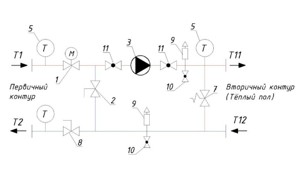 Во время работы системы отопления может возникнуть режим, когда все регулирующие клапаны тёплого пола закрыты. В этом случае насос будет работать в заглушенную систему (без расхода теплоносителя) и быстро выйдет из строя. Для того чтобы избежать подобных режимов, на узле стоит перепускной клапан, который при полном перекрытии клапанов системы тёплого пола открывает дополнительный байпас и позволяет насосу циркулировать воду по малому контуру в холостую без потери работоспособности.