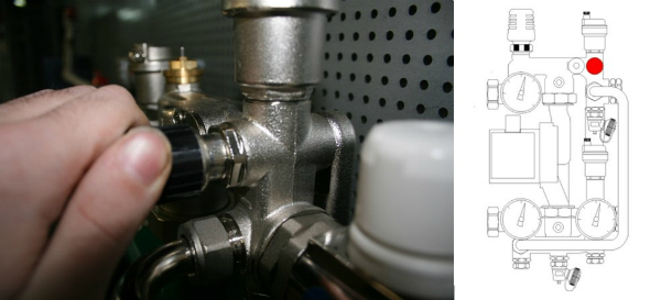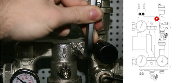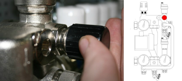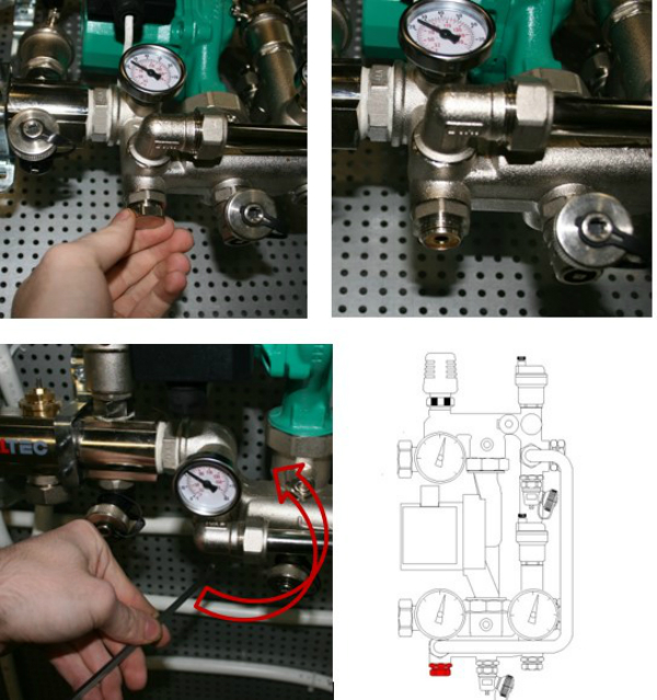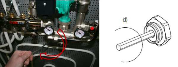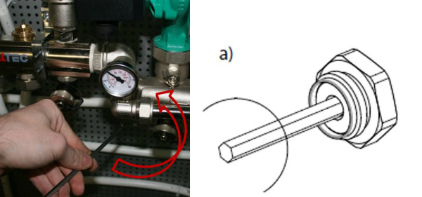 Закрываем балансировочно-запорный клапан первичного контура. Для этого откидываем крышку клапана и шестигранным ключом поворачиваем клапан против часовой стрелки до упора.