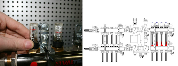 При настройке регуляторами расхода VT.FLC15.0.0 достаточно просто выставить нужный расход на шкале в л/мин поворотом ручки. Если нет возможности использовать индикатор расхода, то отбалансировать ветки можно приблизительно по прогреву полов либо по температуре обратного теплоносителя.
