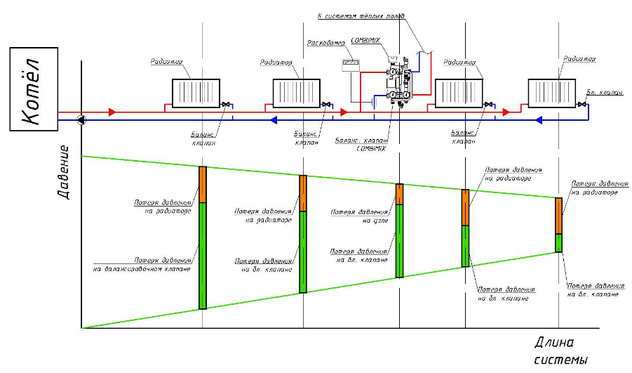 Под схемой изображен пьезометрический график. На графике зелёными наклонными линиями изображено падение давления в системе отопления. Прибор, находящийся ближе всего к котлу (или индивидуальному тепловому пункту), имеет больший перепад давления между прямым и обратным трубопроводом (вертикальные линии), нежели прибор, находящийся в конце системы. Оранжевым цветом на вертикальных линиях показано падение давления на приборах без учёта балансировочных клапанов, зелёным цветом показан перепад давления, который необходимо создать на клапане для того, чтобы сбалансировать систему. Чем выше перепад давления на приборе, тем больший расход при одинаковой пропускной способности через него проходит. Для того чтобы выровнять расходы теплоносителя в системе, необходимо при помощи балансировочных клапанов или регулирующих вентилей добавить сопротивление приборам, которые находятся ближе к котлу. Чем ближе прибор находится к котлу, тем большее сопротивление необходимо добавлять при помощи клапана (большее закрытие клапана). На графике видно, что клапан у первого прибора закрыт настолько, что его сопротивление в несколько раз превышает сопротивление радиатора. У последнего прибора клапан практически открыт и его сопротивление невелико.