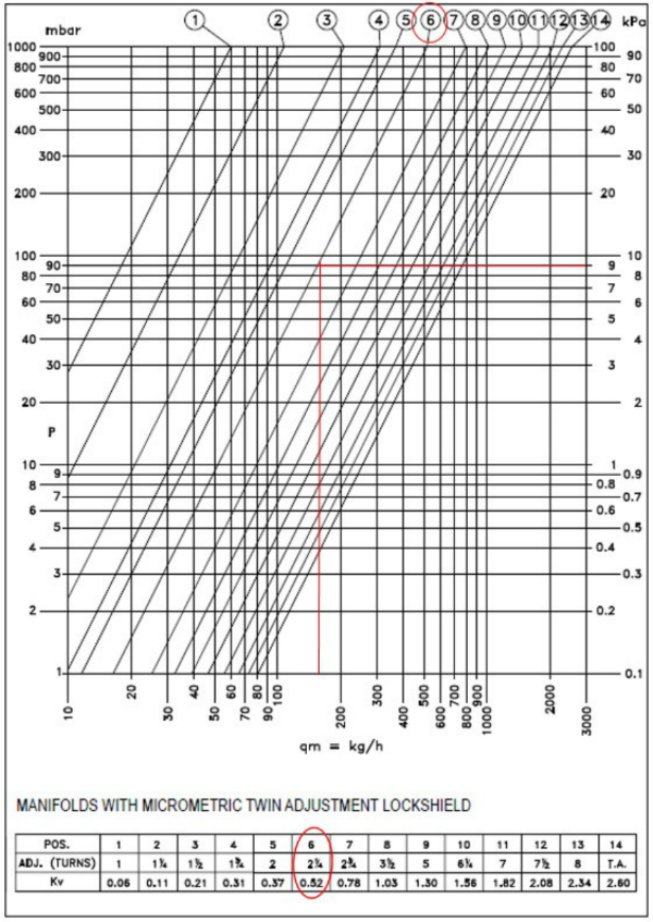 Для определения количества оборотов можно не считать kv а воспользоваться номограммой приведённой ниже. Для этого надо отложить на графике требуемый расход через первичный контур и требуемую потерю давления на клапане. Ближайшая наклонная линия будет соответствовать требуемой настройке (количеству оборотов). Для повышения точности можно интерполировать полученные значения.
