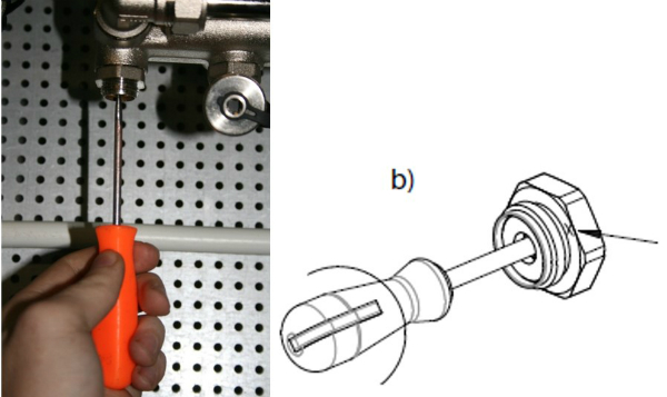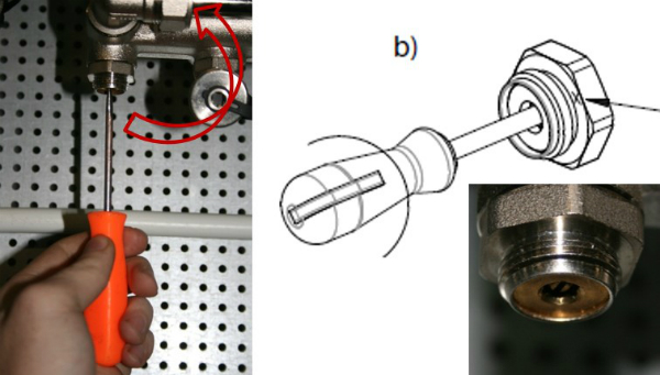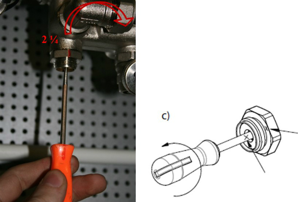 При помощи шестигранного ключа открыть клапан до упора. Клапан откроется ровно настолько, насколько сколько вы сделали оборотов отвёрткой. После настройки клапан при помощи шестигранного ключа можно открывать и закрывать, настройка пропускной способности при этом сохраниться.