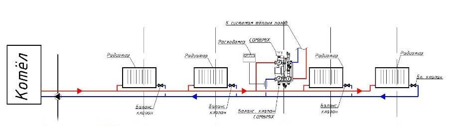 Рассмотрим следующую схему системы отопления с подключённым узлом COMBIMIX. Это двухтрубная тупиковая система отопления с горизонтальной разводкой.