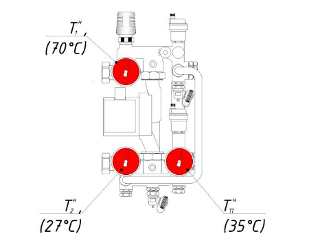 Настройка COMBIMIX: расчётная температура подающего теплоносителя – 90 °С; расчётные параметры контура тёплого пола – 45–35 °С. Фактические показания, снимаемые с термометров: температура подающего теплоносителя – 70 °С.