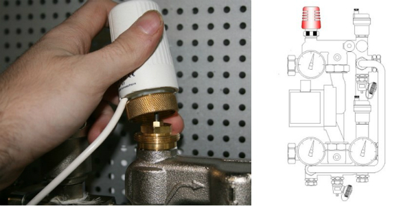 Этот клапан обеспечивает смешение теплоносителя из обратного коллектора тёплого пола с теплоносителем из подающего трубопровода в пропорции, необходимой для поддержания заданной температуры теплоносителя на выходе из узла COMBIMIX.