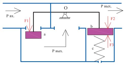 Представим себе коромысло с равными плечами и опорой в точке «О». Коромысло уравновешено двумя поршнями «а» и «b». Входное давление