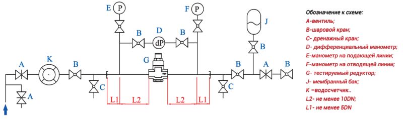 На вход установки подаётся вода с температурой 10–30 °С для редукторов холодной воды и 75–80 °С для редукторов горячей воды. Давление по манометру Е поддерживается 8 бар. С помощью вентиля А и водосчетчика К, устанавливается расход в соответствии с таблицей 3. Расход рассчитан для скорости воды 2 м/с.