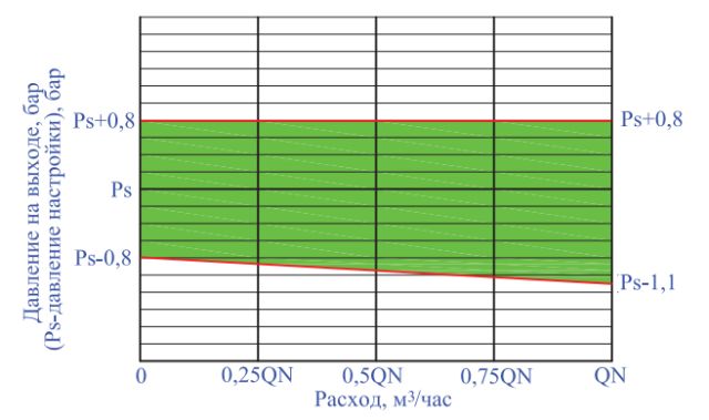 Зависимость давления на выходе от расхода при пониженном входном давлении (п. 8.3.5) проверяется на той же установке, как и в предыдущем тесте (рис. 10). На вход редуктора подаётся давление, на 1 бар ниже настроечного. Затем замеряется давление при плавном изменении расхода от 0 до QN. Полученный график должен лежать в допустимой (зеленой) зоне графика, представленного на рис. 12.