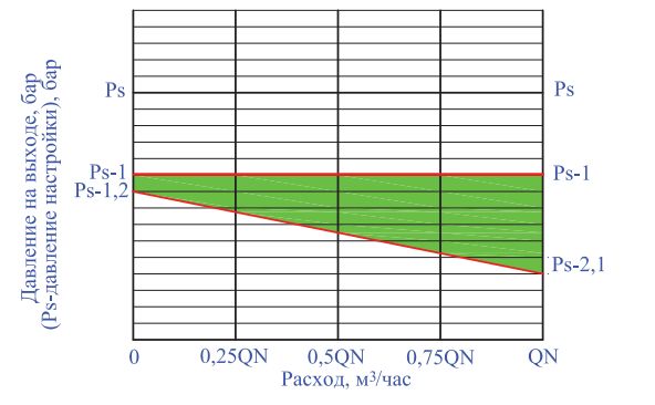 QN определяется в зависимости от типоразмера тестируемого редуктора в соответствии с таблицей 3. Затем расход также плавно снижается от QN до 0. По результатам теста выстраивается график, вид которого представлен на рис. 15. Если гистерезис Δ оказывается свыше 10 %, то такой регулятор давления не рекомендуется использовать в качестве квартирного.