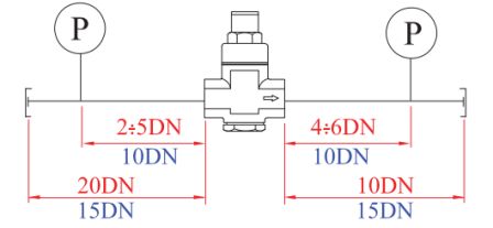 Из таблицы 4 видно, что в соответствии с ГОСТ Р 55023-2012 для редукторов давления должна определяться условная пропускная способность Kvу, чего в европейских нормах нет. Условная пропускная способность редуктора давления определяется по методике ГОСТ Р 55508-2013 (СТ ЦКБА 029-2006) «Арматура трубопроводная. Методика экспериментального определения гидравлических и кавитационных характеристик» (п. 7.3.2). Золотник редуктора устанавливается и фиксируется в положение максимального открытия. Обычно для этого вместо пружины в редуктор помещается специальная фиксирующая втулка. Редуктор устанавливается на стенде (рис. 10). Размеры измерительных участков должны соответствовать рис. 13.