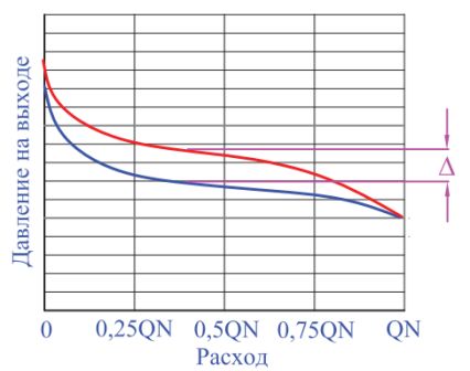 Синим цветом показан график при увеличении расхода,
