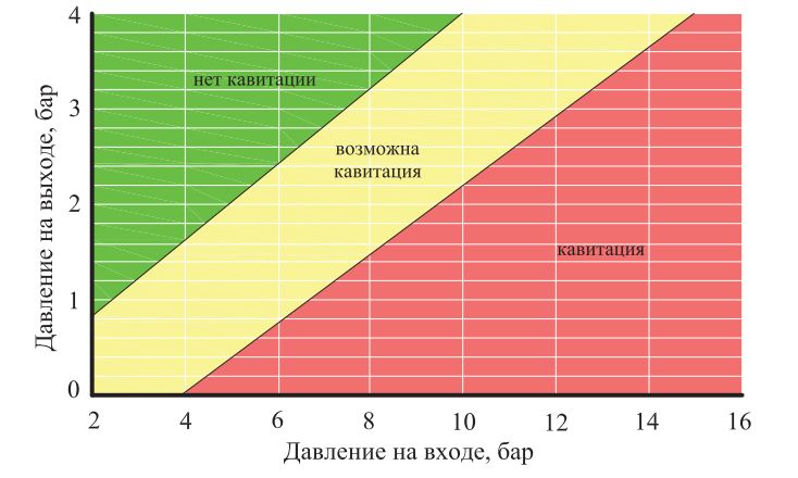 - рабочая точка редуктора по соотношению давлений на входе и на выходе должна лежать в зеленой зоне на диаграмме кавитации (рис. 5);