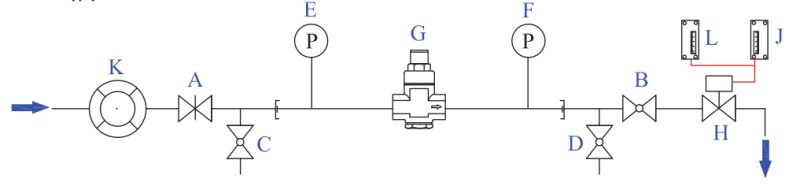 Кроме испытаний, предусмотренных перечисленными выше нормативами, в лаборатории ЛаКИЭлИС определяется показатель гистерезиса редуктора. Дело в том, что при работе редуктора в реальных условиях эксплуатации давление на выходе зависит ещё и от того, в какую сторону в данный момент движется шток с золотником. Это значит, что при одном и том же расходе давление на выходе может быть разным, что связано с проявлением сил трения в соприкасающихся деталях редуктора. Особенно это проявляется в поршневых регуляторах давления. Гистерезис редуктора определяется на стенде, схема которого показана на рис. 10, а общий вид стенда приведён на рис. 14. На вход редуктора подаётся давление 8 бар, и расход плавно повышается от 0 до QN.