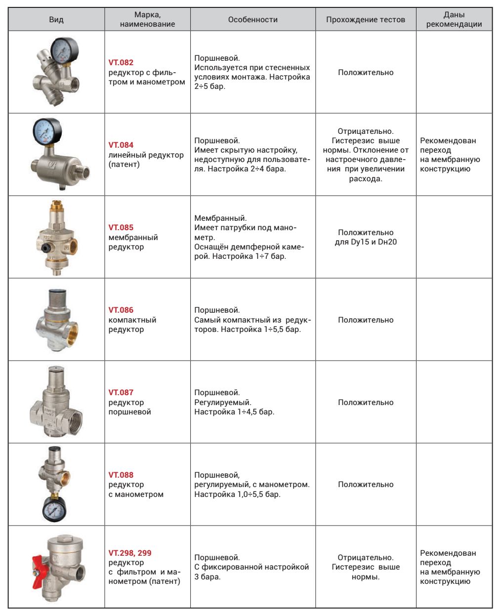 Из приведенной в таблице 1 номенклатуры наибольшим спросом пользуются редукторы, объединённые с шаровым краном и фильтром механической очистки VT.298, VT.299. Они значительно сокращают монтажную длину квартирного узла ввода, недоступны для постороннего вмешательства в заводскую настройку выходного давления и идеально подходят в качестве квартирных регуляторов.