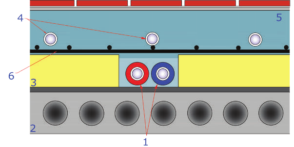 Рис. 19. Прокладка трубопроводов других инженерных систем в конструкции тёплого пола: 1 – трубы радиаторного отопления; 2 – плита перекрытия; 3 – слой утеплителя (пенополистирол); 4 – трубы тёплого пола; 5 – стяжка; 6 – арматурная сетка.