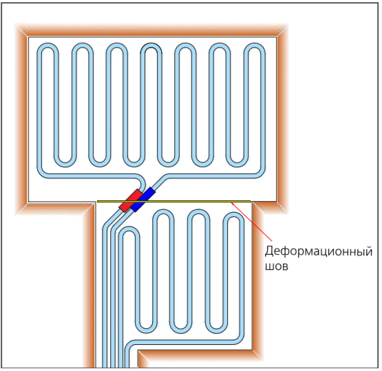 Деформационные швы в «мокрых» тёплых полах заполняются эластичным материалом расчётной толщины. Рекомендуется использовать для швов демпферную ленту из вспененного полиэтилена.